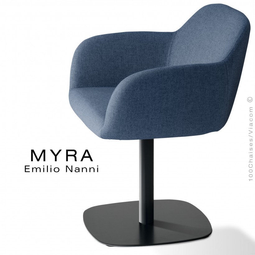 Normes européennesFauteuil design MYRA pour hôtel, café, restaurant, mais aussi le bureau, salle de réunion et maison. Assise, dossier et accoudoirs garnis de mousse polyuréthane, habillage tissu gamme Medley du fabricant Camira, composition 100% PL., ignifugé - BS EN 1021 1&2 Cigarette and Match. Couleur voir palette tissu au choix. Piétement colonne centrale en acier peint, pivotante à 360°. Avec tampons plastiques de protections des sols. Autres tissus tissés, feutres ou aspects cuir synthétique ou finition peinture, vos demandes à commandes@100chaises.fr