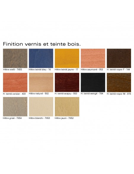 Normes européennesTabouret de cuisine design MOU-SW65, assise coque plastique Restylon, monobloc, teinté dans la masse de couleur noir, blanc, violet et vert. Piétement en bois de hêtre légèrement conique, finition vernis naturel ou autre (voir palette), petite structure sous l'assise en rond d'acier Ø8 mm. avec repose-pieds, finition peinture noir RAL-9005. Avec tampons plastiques de protections des sols. Convient essentiellement pour l'intérieur.