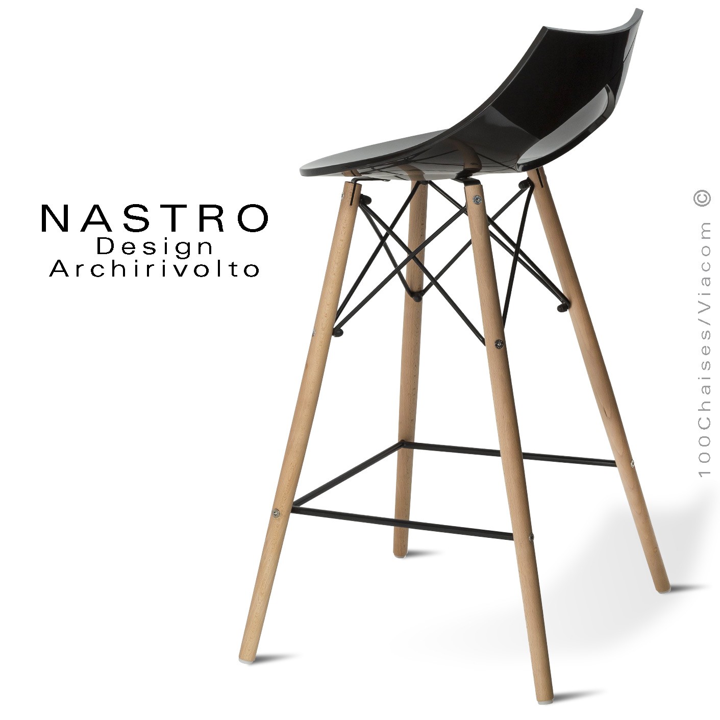 Tabouret de bar design NASTRO, assise coque plastique en Restylon, monobloc, teinté dans la masse. Couleurs noir, blanc, anthracite, taupe, vert pomme, violet. Option coussin d'assise aspect cuir synthétique, gamme Ginkgo du fabricant Griffine, composition 85% PVC, 15% coton. épaisseur 1,3 mm. Certification feu M1 (NFP 92503), AM18 (NFD 60-013), EN 1021.1-2. Couleur coussin en standard anthracite (autre sur demande voir gamme fabricant). Piétement 4 pieds en bois de hêtre légèrement conique, finition vernis naturel ou peint (voir palette), petite structure sous l'assise en rond d'acier Ø8 mm., avec repose-pieds, finition chromé brillant ou peint voir palette fabricant au choix. Avec tampons plastiques de protection des sols. Convient essentiellement pour l'intérieur.