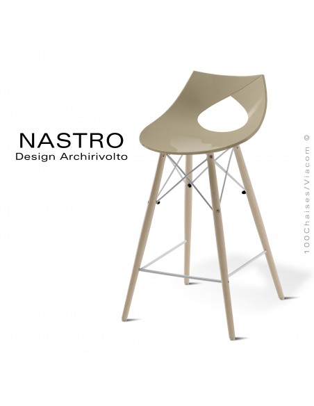 Tabouret du cuisine ou îlot central design NASTRO, piétement bois blanchi, assise coque plastique taupe, option coussin cuir.