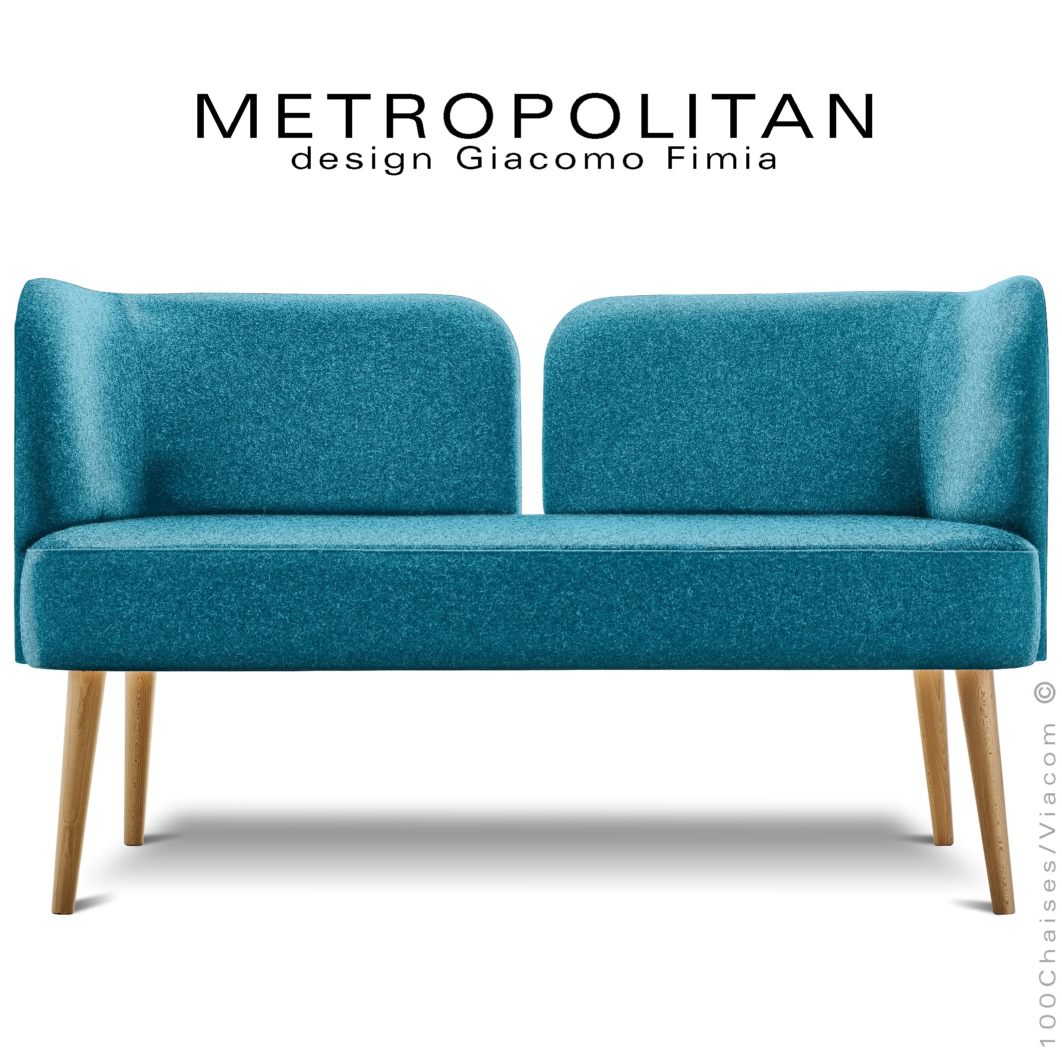 Banquette design 2 places METROPOLITAN, piétement bois de hêtre légèrement conique, finition vernis au choix. Structure assise dossier en multiplis de bois de hêtre, épaisseur 25 mm., garnis de mousse polyuréthane, habillage tissu naturel type feutre 100% laine pour collectivités. Avec tampons plastiques de protection des sols.