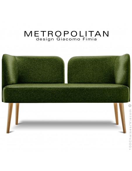 Banquette design 2 places METROPOLITAN, piétement bois de hêtre légèrement conique, finition vernis au choix. Structure assise dossier en multiplis de bois de hêtre, épaisseur 25 mm., garnis de mousse polyuréthane, habillage tissu naturel type feutre 100% laine pour collectivités. Avec tampons plastiques de protection des sols.