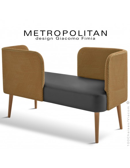 Normes européennesBanquette design conversation ou face à face METROPOLITAN, piétement 4 pieds en bois de hêtre rond et légèrement conique, finition vernis au choix. Avec tampons de protection des sols. Structure en multiplis de hêtre, épaisseur 25 mm., garnis de mousse polyuréthane, habillage assise cuir synthétique gamme Tiffany pour collectivités, composition 83% PVC - 17% PES. Habillage dossier tissu fantaisie BUBBLE du fabricant FLUKSO, 100% PL, ignifugé M1 France.