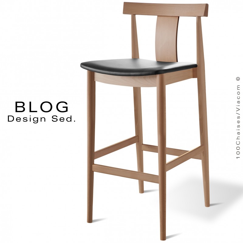 Tabouret de bar en bois BLOG, structure bois de hêtre vernis naturel, assise cuir noir.