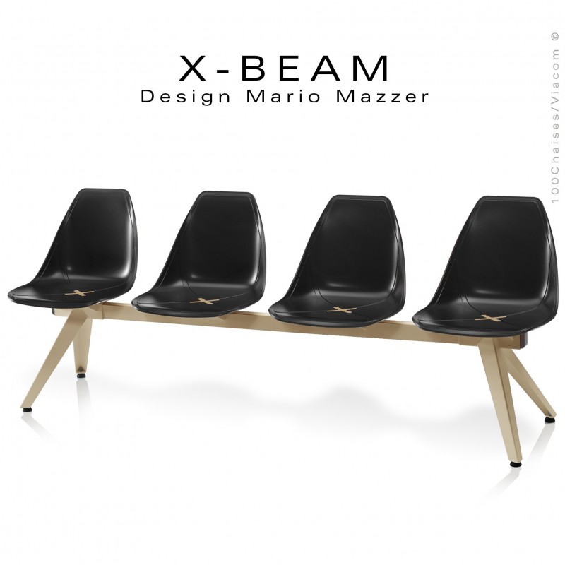 Normes européennesBanc design pour salle d'attente ou assise sur poutre modulable X-BEAM, piétement plat d'acier 5 mm., et tube poutre 80x90 mm., finition peinture blanc, anthracite, sable, argent-gris. Assise coque plastique en polypropylène teinté dans la masse avec incrustation motif X dans la couleur du piétement. Quatre molettes de mise à niveau et protection des sols. Plusieurs options possibles : accoudoirs - tablette porte revue - platine de fixation au sol - assise garnie ou assise et dossier - habillage tissu tissé, cuir synthétique pour collectivités - Vos demandes à commandes@100chaises.fr