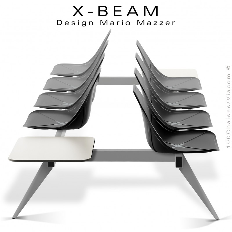 Banc design pour salle d'attente 8 places dos à dos X-BEAM, piétement plat d'acier 5 mm., poutre 80x90 mm., finition peint voir palette. Assise coque plastique en polypropylène avec incrustation motif X dans la couleur du piétement. Deux tablettes portes revues, format : 510x510 mm., épaisseur 12 mm., HPL blanc. Avec quatre molettes de mise à niveau et tampons de protection des sols. Plusieurs options possibles : accoudoirs - tablette porte revue - platine de fixation au sol - assise garnie ou assise et dossier - habillage tissu tissé, cuir synthétique pour collectivités - Vos demandes à commandes@100chaises.fr