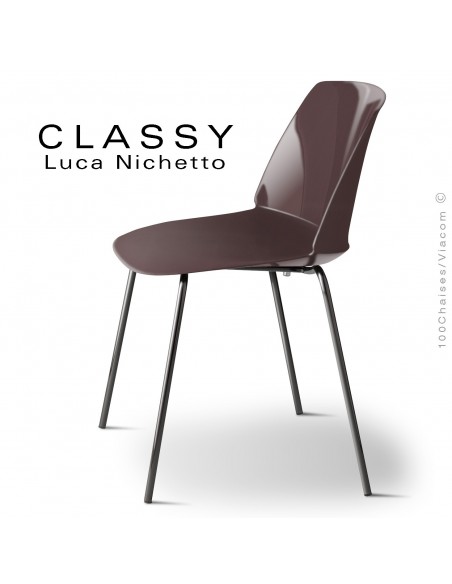 Chaise design CLASSY pour hôtel, café, restaurant, CHR mais aussi pour la maison, convient pour l'intérieur et l'extérieur terrasse (version piétement peint). Assise coque plastique monobloque en polypropylène teinté dans la masse. Piètement 4 pieds en tube d'acier Ø15 mm., finition peinture au choix voir palette (image) ou chromé brillant (sur demande à commandes@100chaises.fr). Avec tampons plastiques de protections des sols. Chaise empilable - Lot de 4 pièces.