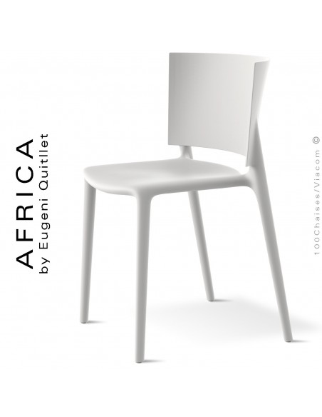 Chaise d'extérieur ou terrasse AFRICA, 4 pieds, avec tampons plastique de protection des sols. Assise et structure coque plastique ou polypropylène, monobloc, teinté dans la masse. Couleur disponible blanc, bronze, écru, bleu navy, noir, rouge, vert pickle (cornichon). Option coussin d'assise tissu gamme NAUTICAL, d'autres gammes sont disponibles voir images (lors de votre commande merci de préciser la couleur souhaitée). Mobilier empilable par 7 pièces. Vos demandes à commandes@100chaises.fr - Lot de 4 pièces.