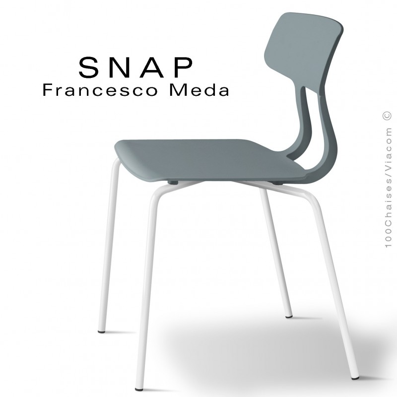 Chaise design esprit rétro SNAP pour hôtel, café, restaurant, CHR, collectivité, domestique, mais aussi pour la maison, convient pour l'intérieur et l'extérieur. Assise coque plastique monobloque en polypropylène teinté dans la masse. Couleur blanche, grise, anthracite, noir, bleu d'eau, pistache, bleu Capri. Piètement 4 pieds en tube d'acier Ø15 mm., finition peinture ou chromé brillant (voir palette fabricant au choix - chromé sur demande). Avec tampons plastiques de protections des sols. Chaise empilable - Lot de 4 pièces.