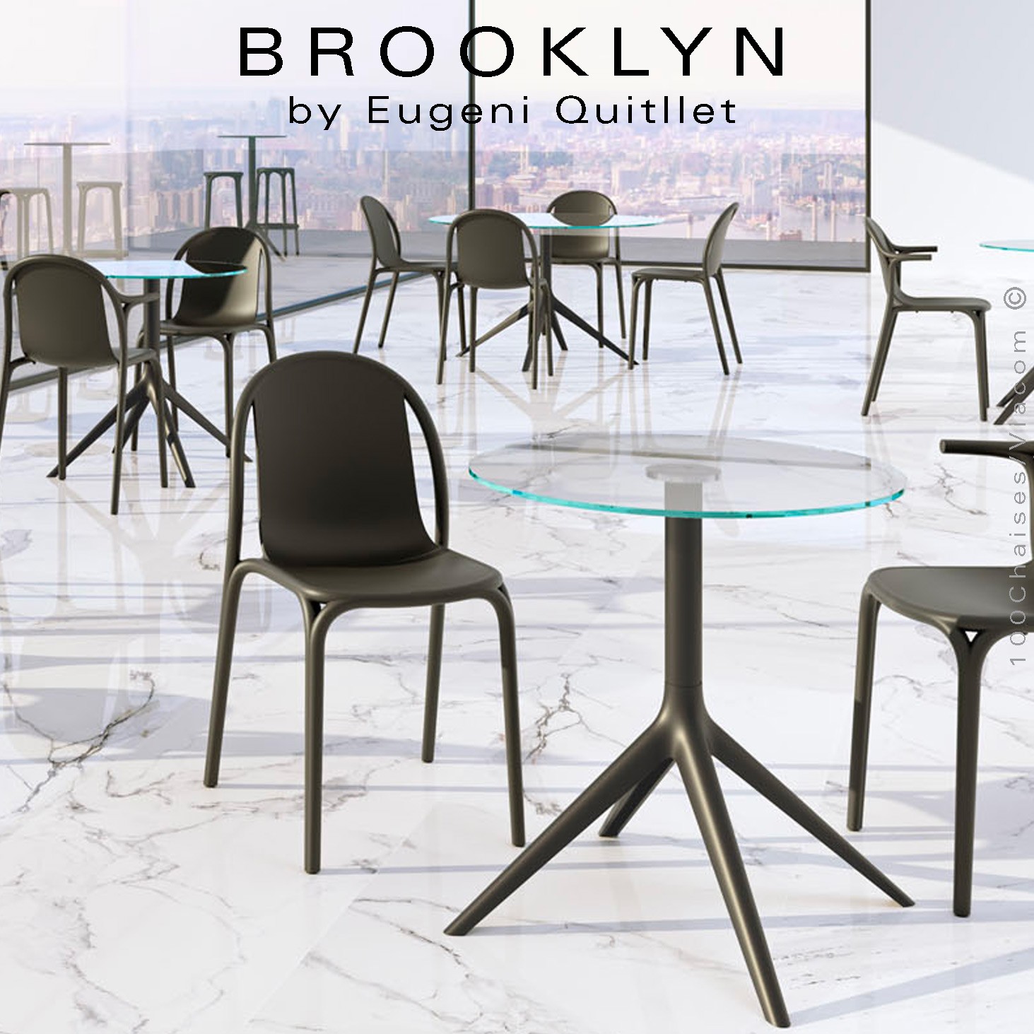 Chaise design BROOKLYN, pour terrasse et jardin. Structure 4 pieds avec tampons plastiques de protection des sols. Assise et structure en plastique ou polypropylène, monobloc par injection renforcé de fibre de verre. Chaise empilable. Disponible dans diverses couleurs blanc, écru, noir, vert pickle (cornichon), teintés dans la masse. Apte pour une utilisation intérieure et extérieure (version laquée d'aspect brillant dans les couleur suivantes blanche, noire, anthracite, milos, cala, manta) sur demande avec coussin d'assise 6 gammes de tissus disponible vos demandes à commandes@100chaises.fr - Lot de 4 pièces.