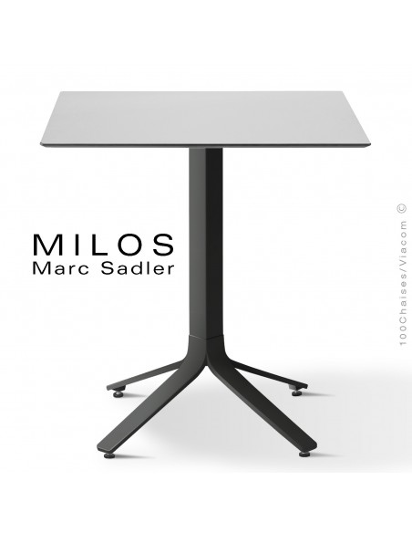 Normes européennesTable repas design MILOS, pour les hôtels, restaurants, café C.H.R. mais aussi pour la maison et le monde domestique, convient pour les terrasses, jardin d'extérieur. Piétement colonne centrale, terminaison quarte branches en fonte d'aluminium finition peint ou aluminium brillant sur demande. Plateau type HPL (high pressure laminate / stratifiée haute pression) de différentes textures et couleurs (voir palette image pour exemple). Avec molettes de mise à niveau ajustable réglable et tampons plastique de protection des sols. Résistant à la salinité, chlore et eaux thermales, dans certaines finitions. Option sur demande avec supplément mécanique plateau rabattable. Pour toute demande de finition spéciale : commandes@100chaises.fr