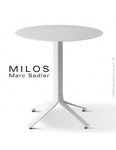 Normes européennesTable repas design MILOS, pour les hôtels, restaurants, café C.H.R. mais aussi pour la maison et le monde domestique, convient pour les terrasses, jardin d'extérieur. Piétement colonne centrale, terminaison quarte branches en fonte d'aluminium finition peint ou aluminium brillant sur demande. Plateau type HPL (high pressure laminate / stratifiée haute pression) de différentes textures et couleurs (voir palette image pour exemple). Avec molettes de mise à niveau ajustable réglable et tampons plastique de protection des sols. Résistant à la salinité, chlore et eaux thermales, dans certaines finitions. Option sur demande avec supplément mécanique plateau rabattable. Pour toute demande de finition spéciale : commandes@100chaises.fr