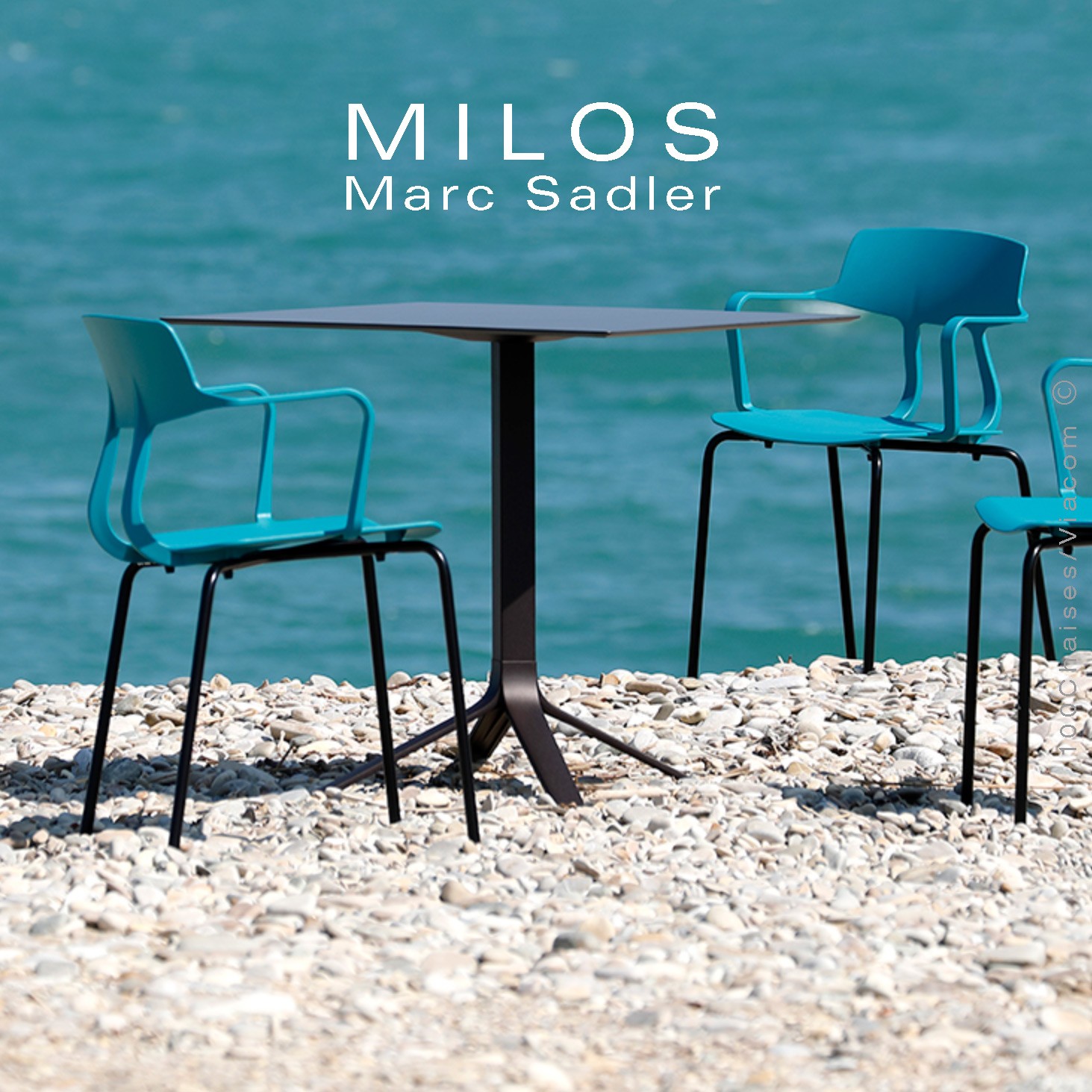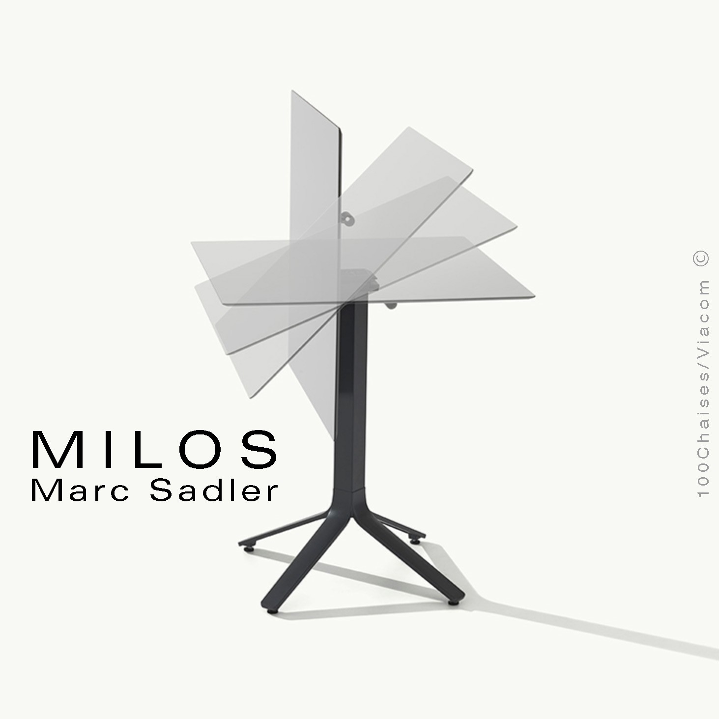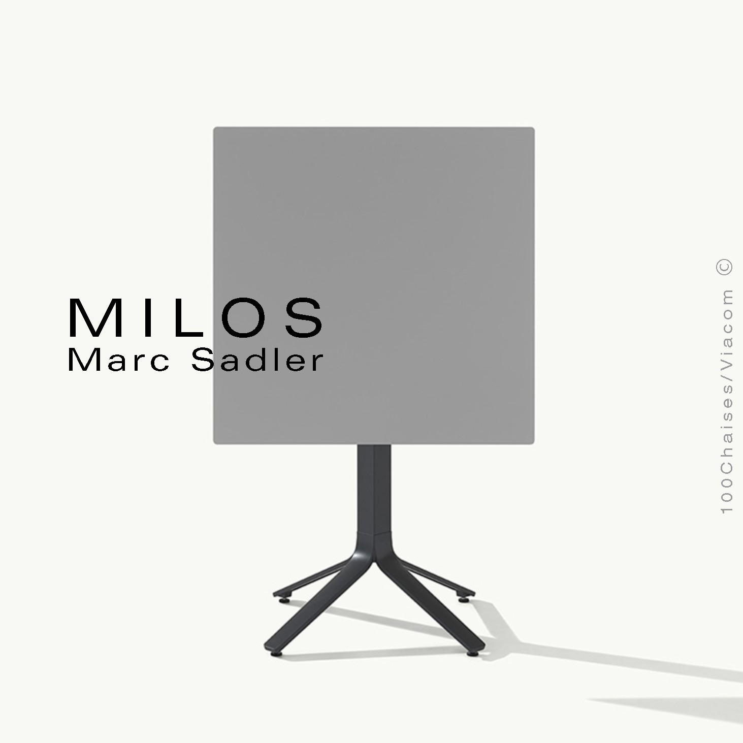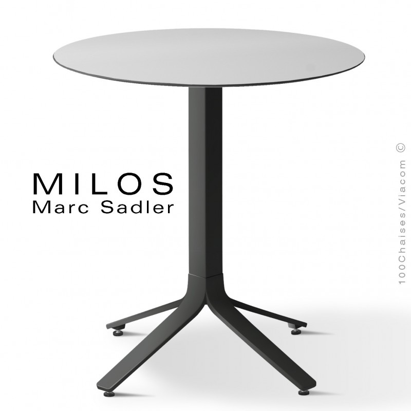 Table repas design MILOS, pour les hôtels, restaurants, café C.H.R. mais aussi pour la maison et le monde domestique, convient pour les terrasses, jardin d'extérieur. Piétement colonne centrale, terminaison quarte branches en fonte d'aluminium finition peint ou aluminium brillant sur demande. Plateau type HPL (high pressure laminate / stratifiée haute pression) de différentes textures et couleurs (voir palette image pour exemple). Avec molettes de mise à niveau ajustable réglable et tampons plastique de protection des sols. Résistant à la salinité, chlore et eaux thermales, dans certaines finitions. Option sur demande avec supplément mécanique plateau rabattable. Pour toute demande de finition spéciale : commandes@100chaises.fr