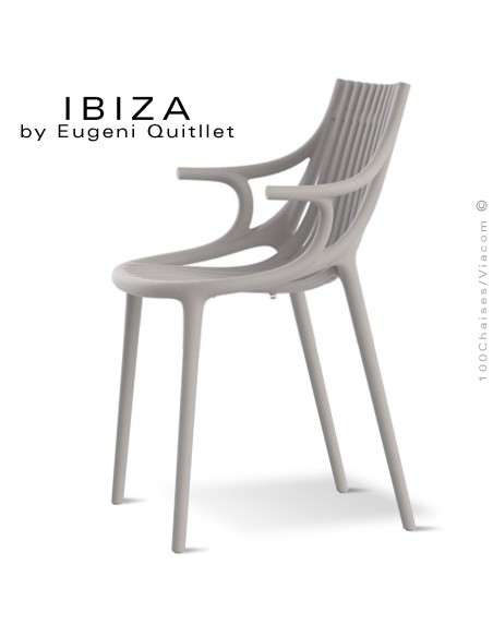 Fauteuil design IBIZA, pour terrasse et extérieur. Structure 4 pieds avec accoudoirs et tampons de protection des sols, assise coque plastique, couleur teinté dans la masse. Option coussin d'assise tissu gamme NAUTIC, d'autres gammes sont disponibles voir images (lors de votre commande merci de préciser la couleur souhaitée). Mobilier empilable par 6 pièces. (votre demande à commandes@100chaises.fr) - Lot de 4 pièces.