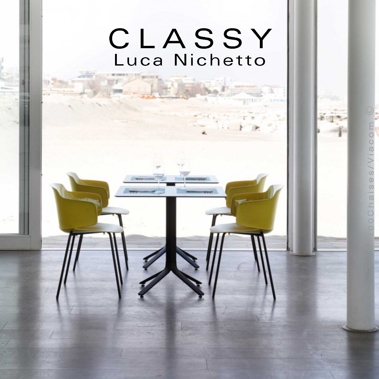 Table mange debout design MILOS, plateau HPL, rond ou carré, pied 4 branches aluminium peint ou brillant, pour extérieur.