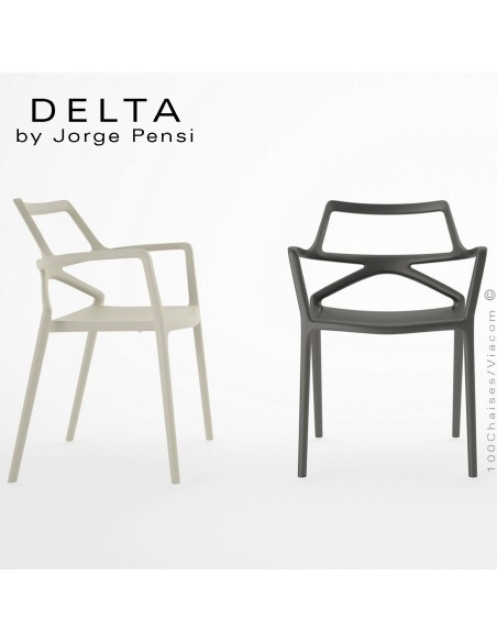 Fauteuil design DELTA, pour terrasse et extérieur. Structure 4 pieds avec accoudoirs et tampons de protection des sols, assise coque plastique, couleur teinté dans la masse. Option coussin d'assise tissu gamme NAUTICAL (lors de votre commande merci de préciser la couleur souhaitée). Mobilier empilable par 8 pièces. (Autre gamme de tissu disponible, voir palette image : Silvertex, Crevin, Dralon, Heritage, savane votre demande à commandes@100chaises.fr) - Lot de 4 pièces.