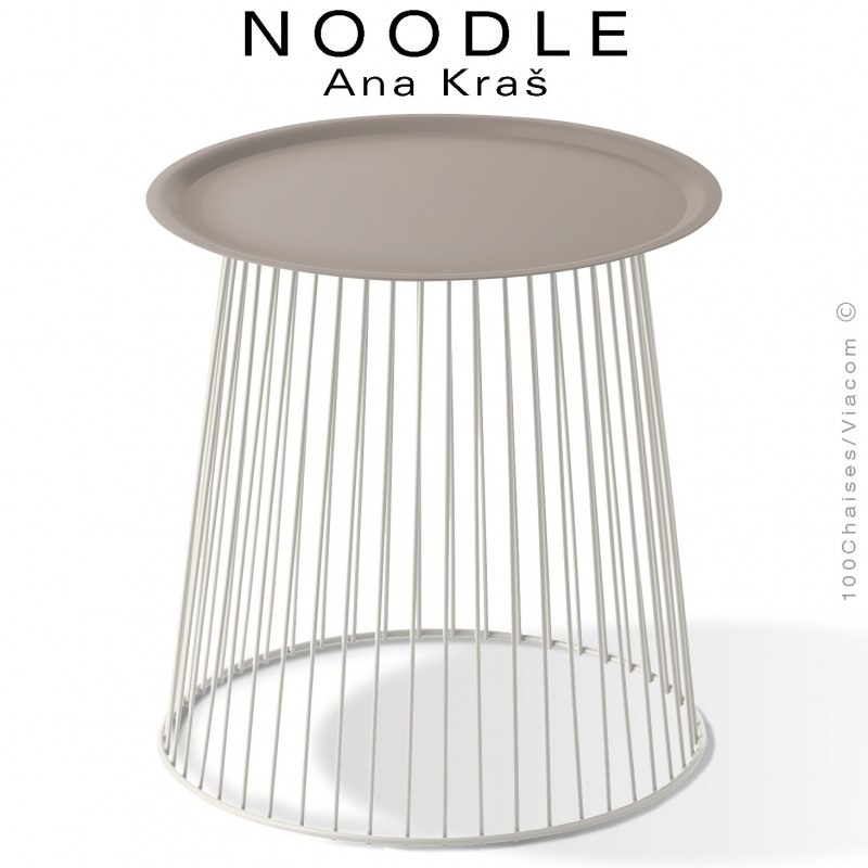 Table basse ronde design NOODLE, pour les hôtels, restaurants, CHR, ou l'élément décoratif de votre salon. Structure, pied en fil d'acier rond, retournable. Plateau Ø42 cm., amovible en tôle d'acier peinte. Disponible dans une large gamme de textures et de couleurs (12 possibilités de couleurs). Version d'extérieur avec cataphorèse (sur demande). Vos demandes de finition spéciale : commandes@100chaises.fr