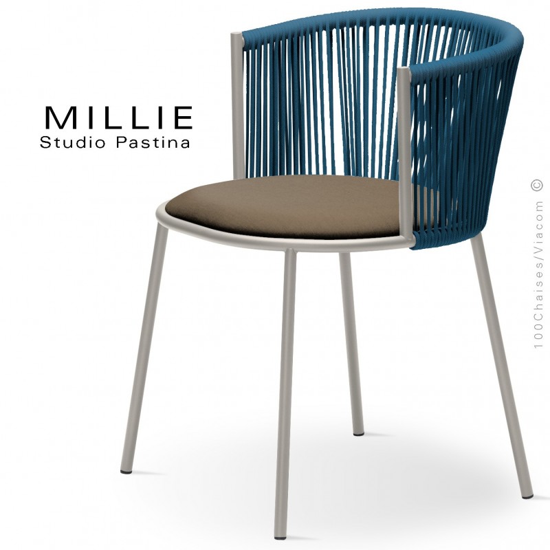 Fauteuil MILLIE SP, piétement acier sand, assise tissu 419marron, dossier corde bleu