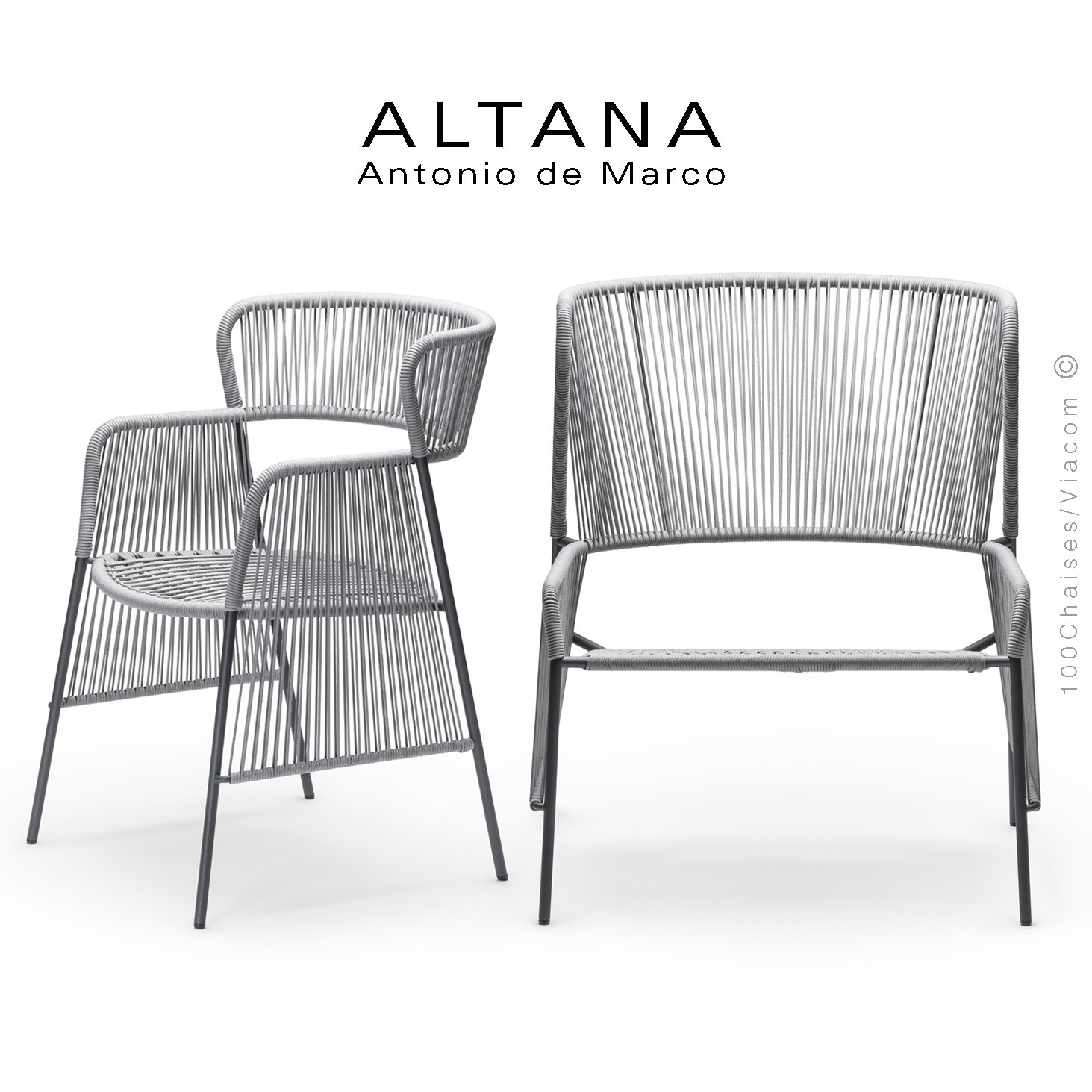 ALTANA est une collection d'assises et de tables métalliques. Elle se compose d'un fauteuil, d'un fauteuil lounge aux dimension généreuses et enveloppantes. Une collection conçue pour les espaces extérieurs, les terrasses d'hôtels et de restaurants ou votre jardin. La structure est en acier peint, elle résistant aux U.V. et aux intempéries. Les cordes marines qui recouvre l'ensemble de la collection, devienne un élément caractéristique de la collection. Les formes et le dessin du tissage reprennent et réinterprètent le style colonial des sièges d'extérieur selon l'interprétation d'Antonio De Marco. Ils donnent aux sièges une connotation estivale et ensoleillé.