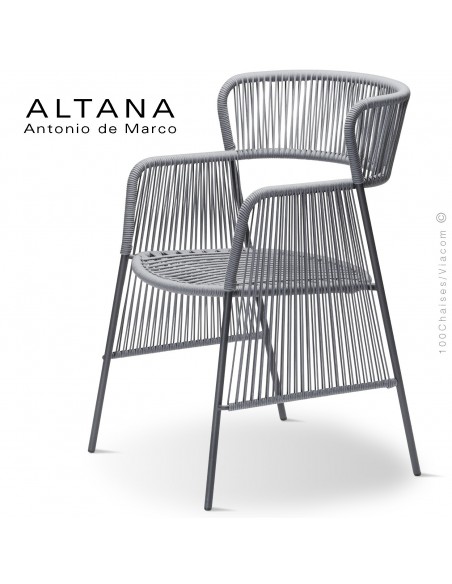 Normes européennesFauteuil d'extérieur design ALTANA-SP, pour votre terrasse d'hôtel, bar et restaurant mais aussi pour votre véranda, jardin, terrasse, piscine, tonnelle, pergola, pool house, plagiste bord de mer. Structure et piétement 4 pieds tube d'acier Ø18 mm., peint, couleurs disponibles marron, anthracite, sable avec bouchons de protection des sols. Assise et dossier habillage tressage corde marine résistant aux intempéries, couleurs bleu, anthracite, gris ou brun au choix. Demande et informations sur commandes@100chaises.fr