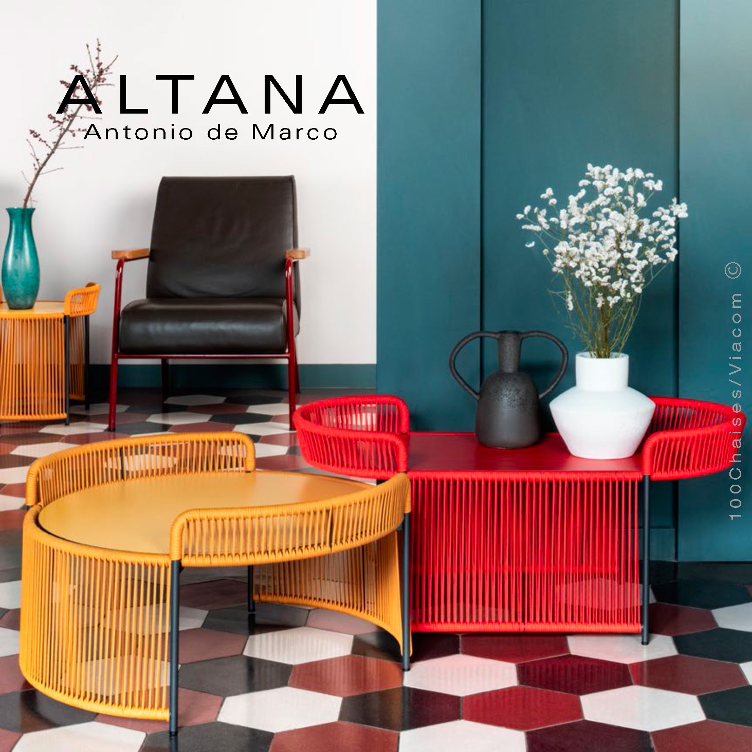 ALTANA est une collection d'assises et de tables métalliques. Elle se compose d'un fauteuil, d'un fauteuil lounge aux dimension généreuses et enveloppantes. Une collection conçue pour les espaces extérieurs, les terrasses d'hôtels et de restaurants ou votre jardin. La structure est en acier peint, elle résistant aux U.V. et aux intempéries. Les cordes marines qui recouvre l'ensemble de la collection, devienne un élément caractéristique de la collection. Les formes et le dessin du tissage reprennent et réinterprètent le style colonial des sièges d'extérieur selon l'interprétation d'Antonio De Marco. Ils donnent aux sièges une connotation estivale et ensoleillé.