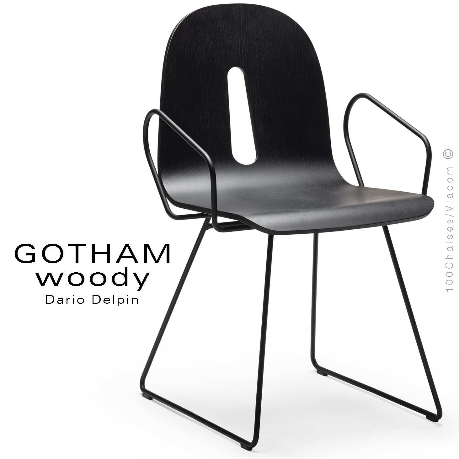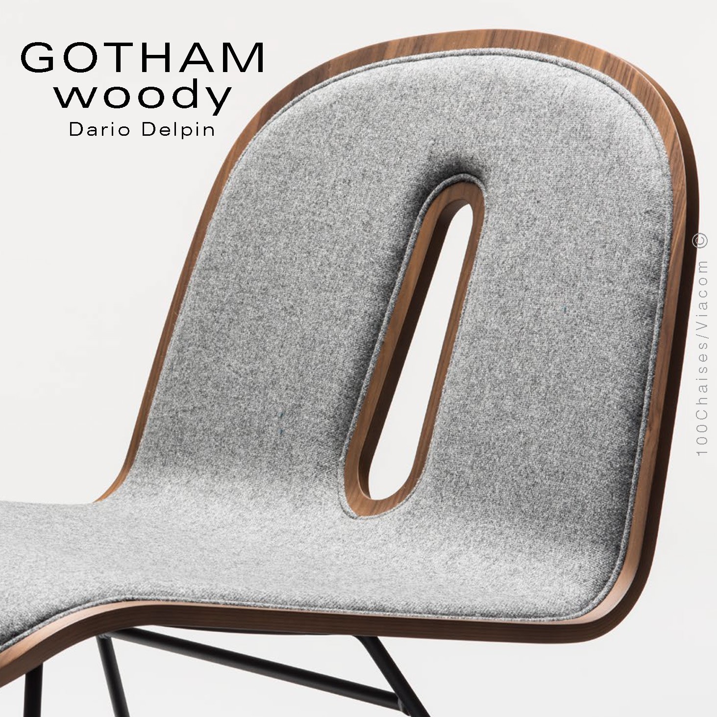 Normes européennesChaise design GOTHAM WOODY-SL, pour les hôtels, cafés, restaurants ou la maison, cuisine, salle à manger. Assise coque en multiplis de bois de hêtre, cintré à la vapeur, monobloc. Finition plaquage Noyer naturel, vernis incolore (naturel) ou teinté noir mat. Piétement type luge en rond d'acier Ø12 mm., avec tampons plastique de protection des sols. Mobilier non empilable - Vos demandes à commandes@100chaises.fr