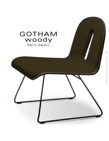 Chaise confort GOTHAM WOODY lounge, piétement luge acier peint, assise bois placage Noyer, habillage tissu.
