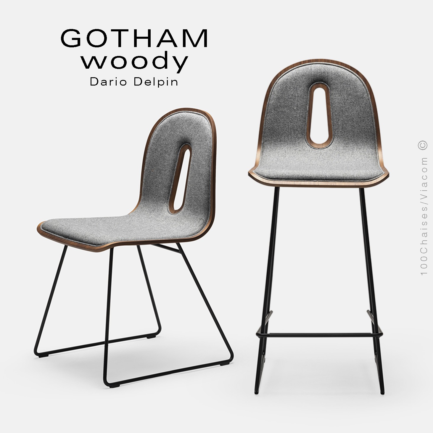 Normes européennesChaise confort GOTHAM WOODY LOUNGE, pour les hôtels, cafés, restaurants ou votre salon lounge et espace domestique. Assise coque en multiplis de bois de hêtre, cintré à la vapeur, monobloc. Finition plaquage Noyer naturel, vernis incolore (naturel) ou teinté noir mat. Piétement type luge en rond d'acier Ø12 mm., avec tampons plastique de protection des sols. Assise et dossier garnis de mousse polyuréthane avec habillage tissu du fabricant ABITEX, gamme ANGEL-COMBO, 100% polypropylène, ignifugé : EN 1021 part 1/2 - NF D 60-013:06 - AM 18 (convient uniquement pour l'intérieur). Mobilier non empilable - Vos demandes à commandes@100chaises.fr,