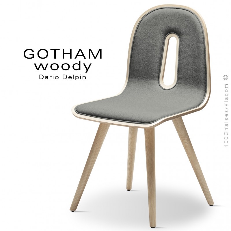 Normes européennesChaise design GOTHAM WOODY-SI, pour les hôtels, cafés, restaurants ou usage domestique, cuisine, salle à manger, chambre ou bureau. Assise coque en multiplis de bois de hêtre, cintré à la vapeur, monobloc, habillage tissu du fabricant ABITEX, gamme ANGEL COMBO, 100% polypropylène, ignifugé : EN 1021 part 1/2 - NF D 60-013:06 - AM 18 (convient uniquement pour l'intérieur). Structure et piétement 4 pieds coniques en bois de Frêne massif avec tampons plastique de protections des sols. Finition vernis naturel, teinté noyer, noir mat ou blanc. Vos demandes : commandes@100chaises.fr