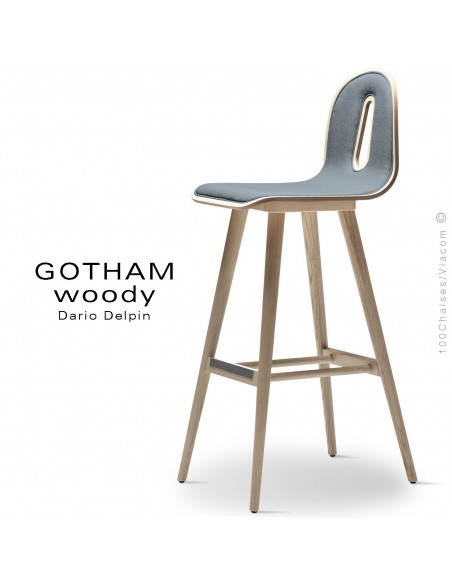 Tabouret de bar design GOTHAM WOODY-SG-80-I, piétement bois de Frêne conique, assise multiplis de bois habillage tissu.