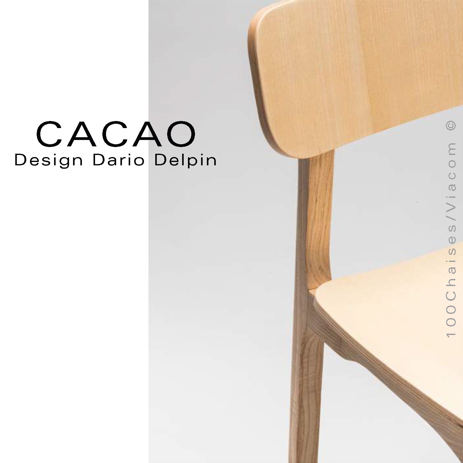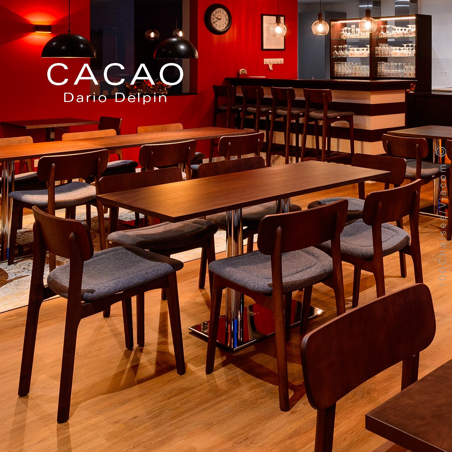 Chaise bois design CACAO-S, pour les professionnels, CHR, bistrot, café, restaurant, cantine, restauration d'entreprise, collectivités, médiathèque, bibliothèque, centre de documentation mais aussi pour le particulier, cuisine, salle à manger, chambre, bureau. Structure 4 pieds en bois massif de Frêne avec tampons plastique de protection des sols. Dossier multiplis de bois légèrement cintré à la vapeur, assise garnie de mousse polyéthylène, habillage tissu tissé gamme Angel Combo du fabricant Abitex, ignifugé EN 1021 part 1/2 - NF D 60-013:06 - AM 18 (convient uniquement pour l'intérieur).