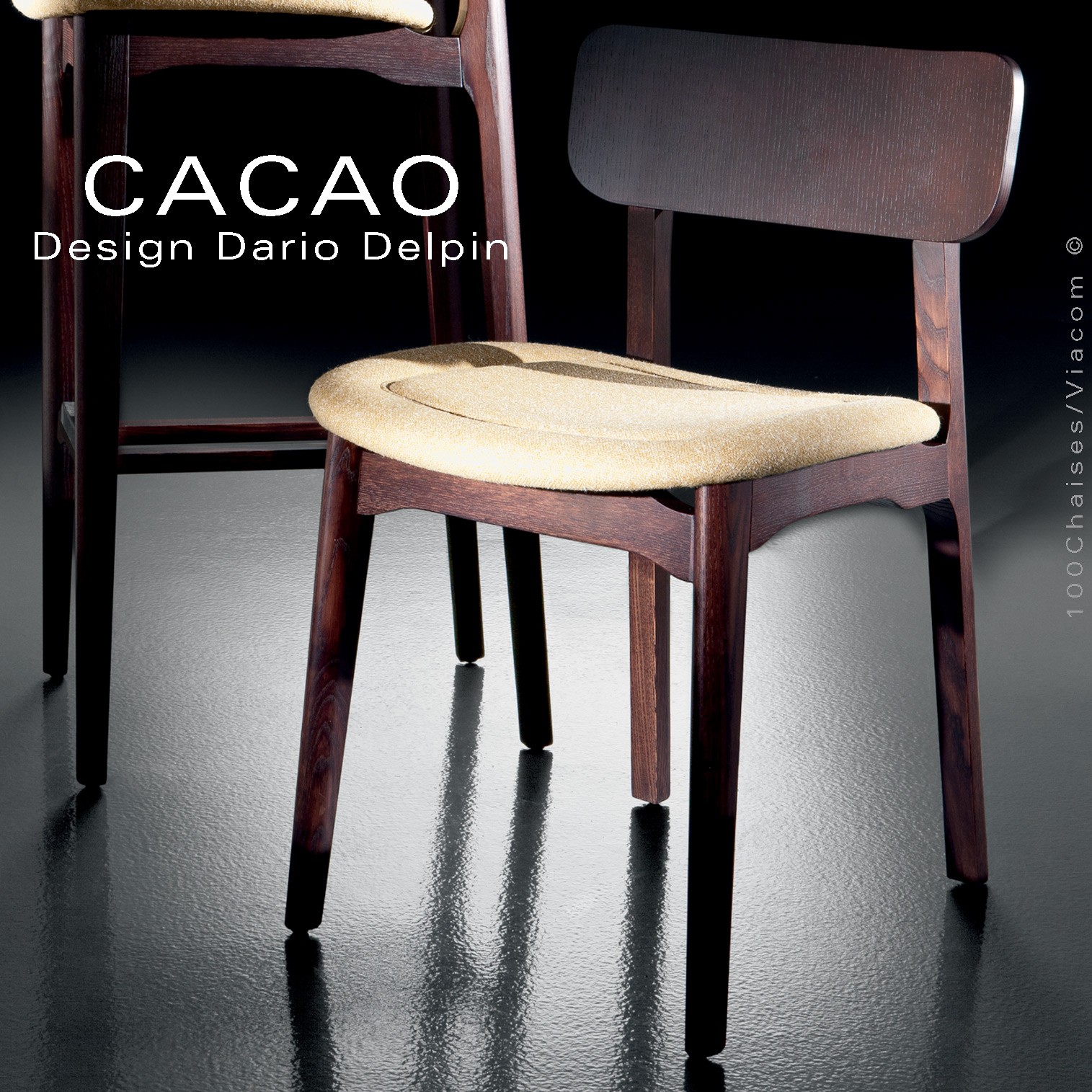 Chaise bois confort design CACAO, structure 4 pieds en bois massif de Frêne, vernis naturel ou teinté, assise habillage tissu.