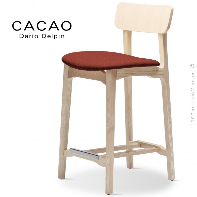 Tabouret bois de cuisine design CACAO, structure bois de Frêne avec repose pieds, vernis ou teinté, assise habillage tissu.