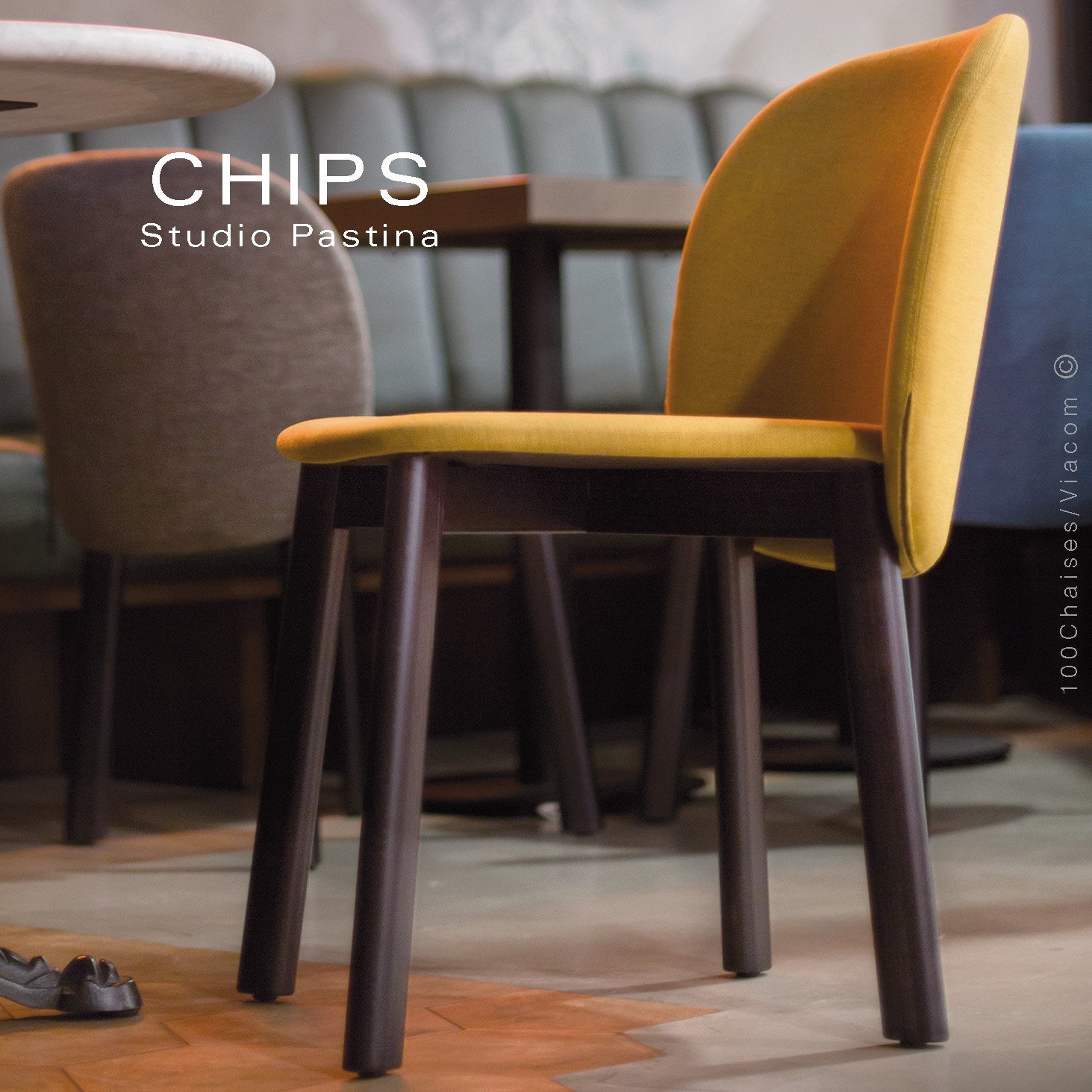 La collection CHIPS est résolument tendance et optimiste. Un ensemble de chaises et de tabourets dont le dossier est sans doute leur élément le plus emblématique et le plus caractéristique. Avec ses courbes amples et sa taille généreuse, il semble presque dépasser les limites de la simple fonctionnalité et, en s'étendant au-delà du siège, il redéfinit son espace de manière inédite, donnant naissance à une création originale et captivante. C'est une conception qui joue avec un double contraste de volumes, celui horizontal dominé par le dossier, et celui vertical, s'étendant sous le siège. Les pieds sont fins et élancés, notamment dans les modèles dotés soit d'une base luge métallique, soit de pieds en hêtre. La linéarité verticale des bases, complétée par la forme allongée du dossier, est particulièrement évidente dans les tabourets à double hauteur de cette collection.