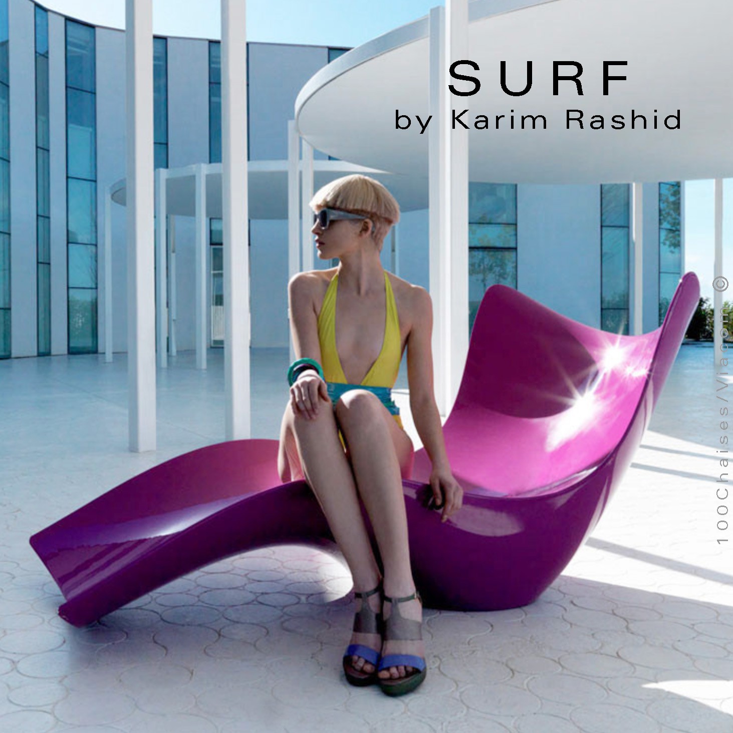 Bain de soleil lounge ou chaise longue design SURF, pour terrasse, SPA, pool house, piscine, bord de mer. Structure plastique en polyéthylène, résine semi-cristalline d'aspect lise, monobloc, teinté dans la masse. Avec tampons de protection des sols, couleurs au choix suivant palette. Bain de soleil empilable par deux pièces - Lot de 2 pièces.