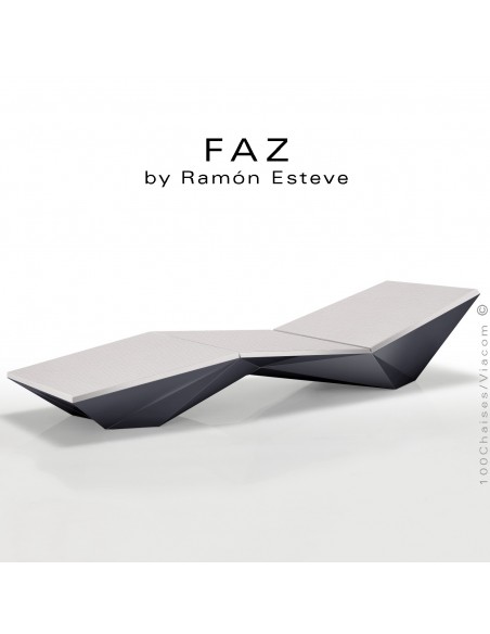 Bain de soleil ou chaise longue design FAZ, pour terrasse, SPA, pool house, piscine, bord de mer. Structure plastique polypropylène teinté dans la masse, dossier fixe. Avec tampons de protection des sols. Avec coussin garni de mousse polyuréthane, habillage tissu gamme CREVIN. Non empilable. Autres gammes coussin : NAUTIC ou SILVERTEX, vos demandes à commandes@100chaises.fr