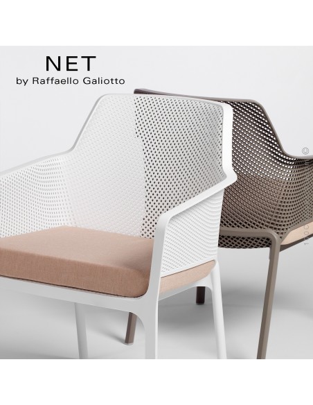La collection NET se caractérise par un design simple, raffiné et épuré. Les sièges sont réalisés d'une seule pièce, colorés dans la masse, ils allient la solidité à la recherche du détail et de la finesse. L'assise et le dossier perforés sont le détail esthétique qui caractérise la collection, un motif qui permet à NET d'être installé dans divers environnements extérieurs et intérieurs. Une particularité est l'utilisation du polypropylène, qui est entièrement recyclable et non contaminé par d'autres matériaux. À la fin de sa vie, le produit est broyé et homogénéisé avec une couleur uniforme. Cela permet la fabrication de nouveaux produits qui sont à leur tour recyclables. Le polypropylène régénéré donne vie à de nouveaux produits dans une économie circulaire. Avec un produit régénéré, l'utilisation de matières premières et d'énergie est réduite, ce qui présente un net avantage pour l'environnement.