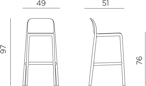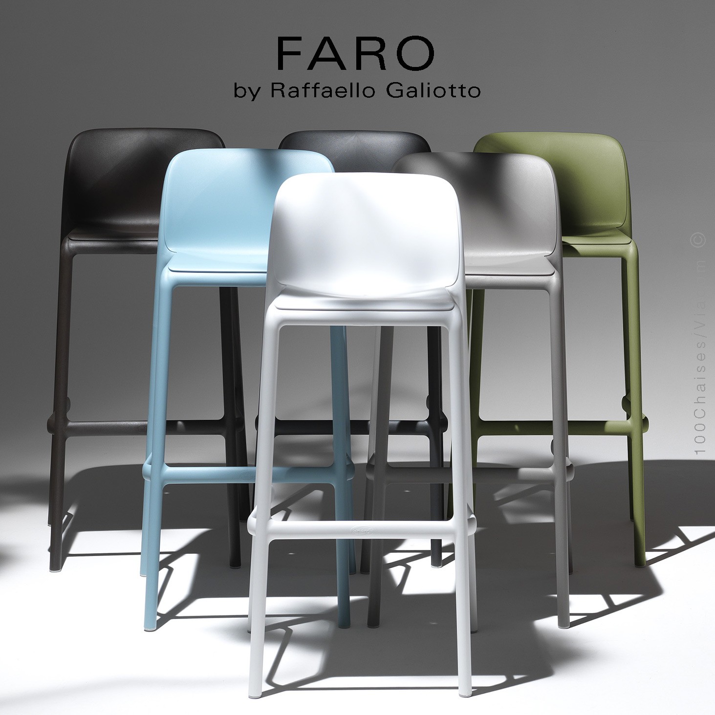 Tabouret de bar design FARO, convient pour l'extérieur terrasse hôtel, restaurant, snack, bistrot, CHR, mais aussi pour la maison, cuisine d'été. Structure 4 pieds monobloc en plastique ou polypropylène "FIBERGLASS", surface effet mat, traité anti-UV et coloré dans la masse (résine recyclable), tabouret empilable. Avec repose pieds et dossier, plus tampons plastique de protection des sols, anti-dérapant - Lot de 4 pièces.