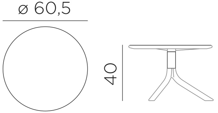 Table basse design SPRITZ, piétement type colonne centrale terminaison trois branches en plastique ou polypropylène "FIBERGLASS" traité anti-UV et coloré dans la masse, surface effet mat. Hauteur 40 cm. Avec tampons plastique de protection de sols. Plateau dimension Ø650 mm., plastique plein. Couleurs au choix suivant palette fabricant.