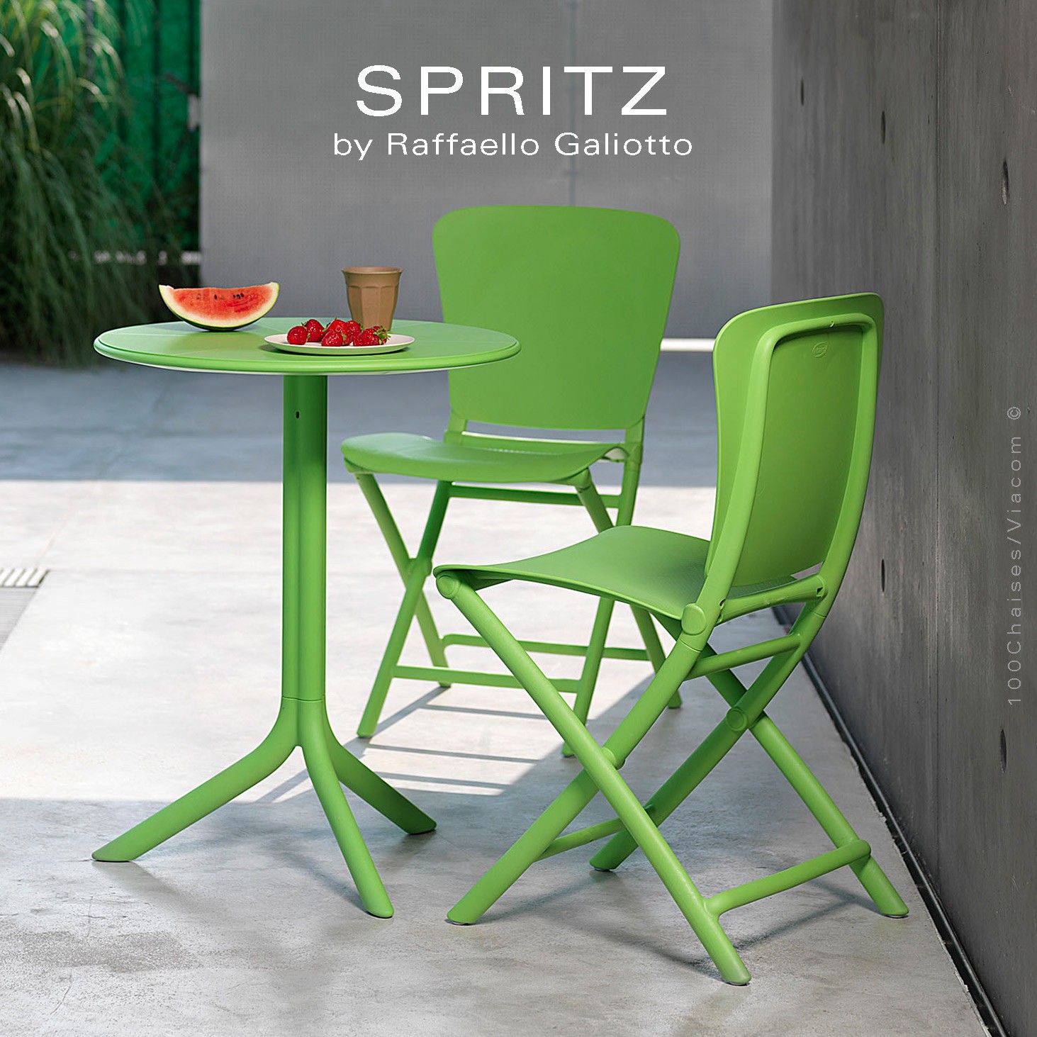 Table basse SPRITZ, plateau rond plastique plein, piétement colonne centrale plastique vert.