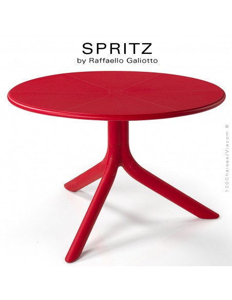 Table SPRITZ, plateau rond plastique plein, piétement colonne centrale plastique rouge.
