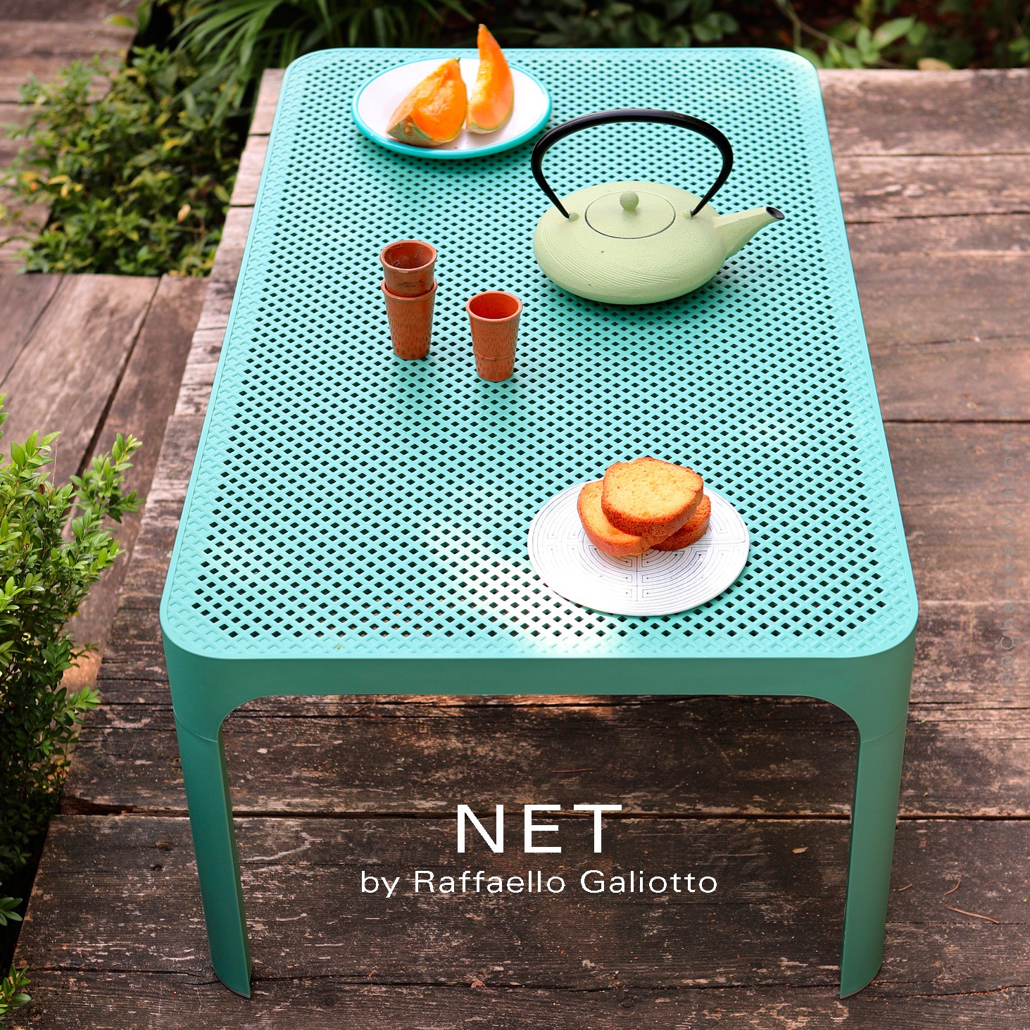 Normes européennesTable basse design NET table 100. Pour vos espaces extérieurs. Structure 4 pieds plastique, polypropylène "FIBERGLASS" traité anti-UV et coloré dans la masse effet mat, résine recyclable. Plateau ajouré de motif carré décoratif. Avec patins anti-dérapant. Demandes et informations à : commandes@100chaises.fr