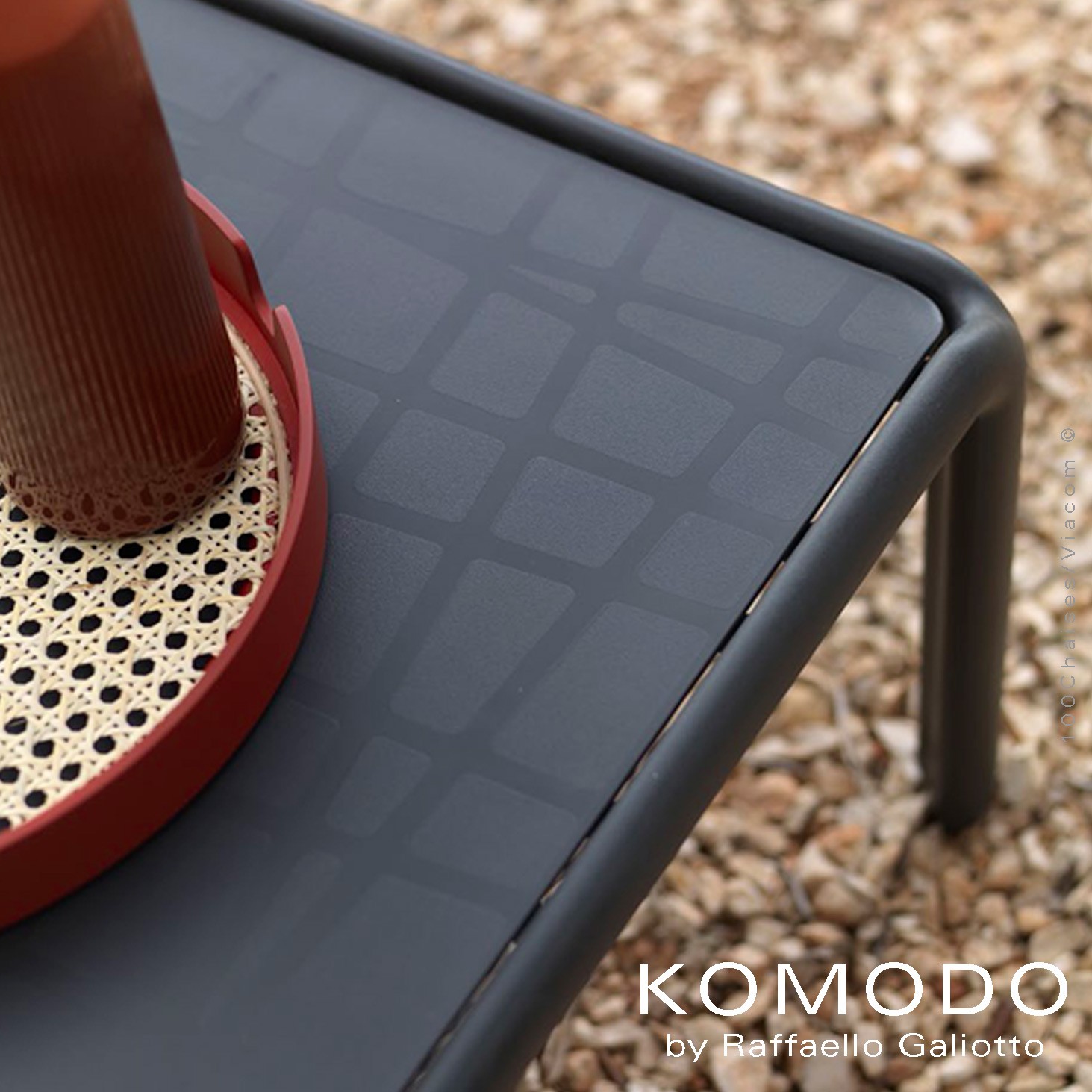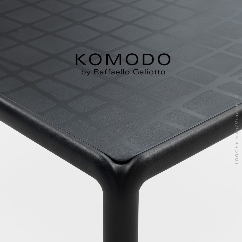 Table basse design KOMODO. Pour vos espaces extérieurs. Structure et plateau plastique en polypropylène "FIBERGLASS" traité anti-UV et coloré dans la masse effet mat, résine recyclable. Piétement quatre pieds avec patins anti-dérapant. Dimensions plateau 700x700 mm., avec un motif de décoration bas relief, organique de ligne qui se croisent, hauteur total de la table 325 mm.