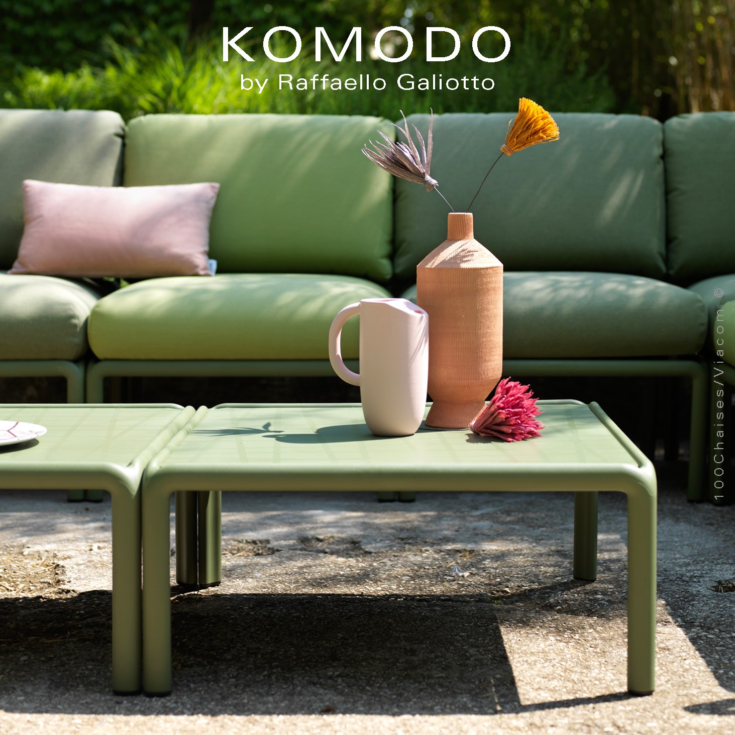 La collection de canapés KOMODO est un système d'assise modulaire qui peut être configuré comme vous le souhaitez. Elle est composée de 5 modules différents : droite, gauche, centre, angle, pouf. Les différentes structures sont réalisées en fibre de verre polypropylène traitée contre les UV et colorée dans la masse. Tous les différents modules ont la même base, les dossiers et les accoudoirs se clipsent de tous les côtés de l'assise. Les coussins d'assise sont amovibles / zippables épaisseur 18 cm., avec boutons. Les coussins de dossier ont une épaisseur de 22 cm. et peuvent être fixés avec des crochets.