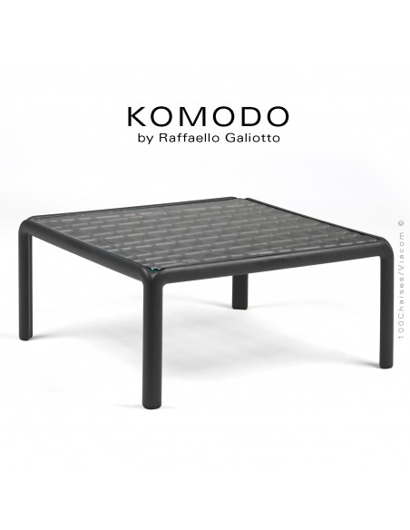 Table basse KOMODO, structure 4 pieds plastique anthracite, plateau carré verre.