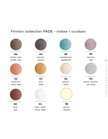 Normes européennesFauteuil design lounge FADE, pour l'extérieur, terrasse, jardin, pergola, pool house ou terrasse à la montage. Structure polyéthylène réalisé par moulage d'un seul bloc, disponible en 4 couleurs teintés dans la masse, U4-pierre, T9-argile, U0-pierre de lave, S4-granit.