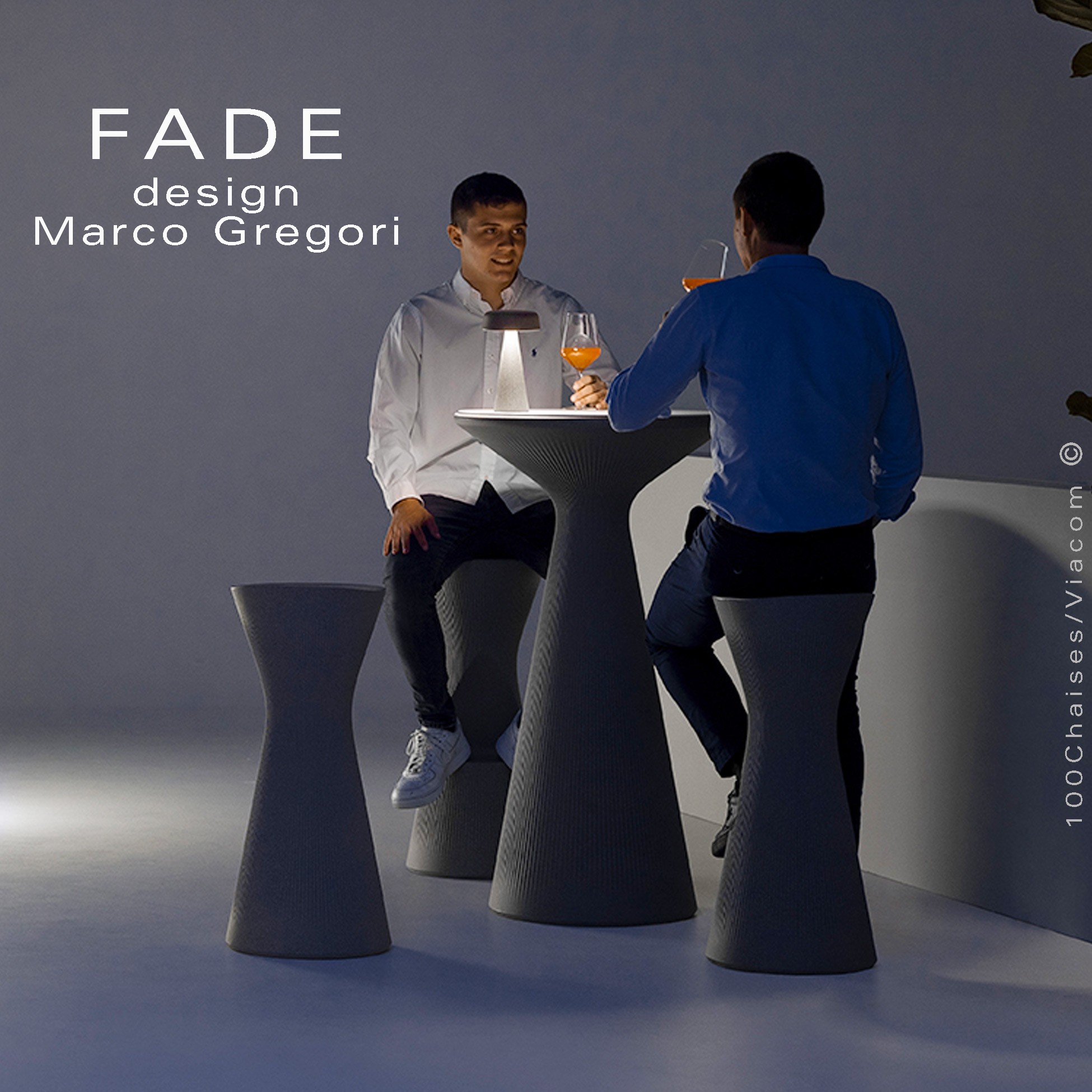 Normes européennesTable haute ou mange debout design FADE, pour l'extérieur, terrasse, jardin, pool house. Structure en plastique ou polyéthylène d'un seul bloc (monobloc), teinté dans la masse, disponible en 5 couleurs teintés dans la masse, U4-pierre, T9-argile, U0-pierre de lave, S4-granit, blanc-U1. Option plateau Ø600 mm., compact HPL, blanc ou noir, pour usage intérieur et extérieur, avec option kit sable sec pour lest. Autre option kit fixations au sol (sur demande). Table dotée d'une grande stabilité, qui nécessite un plateau HPL à choisir séparément. Sa surface nervurée crée un jeu d'ombres unique et les finitions spéciales rappellent les matériaux naturels. Dans la version à lumière blanche, la table peut être éclairée en l'équipant d'un kit d'éclairage spécial.
