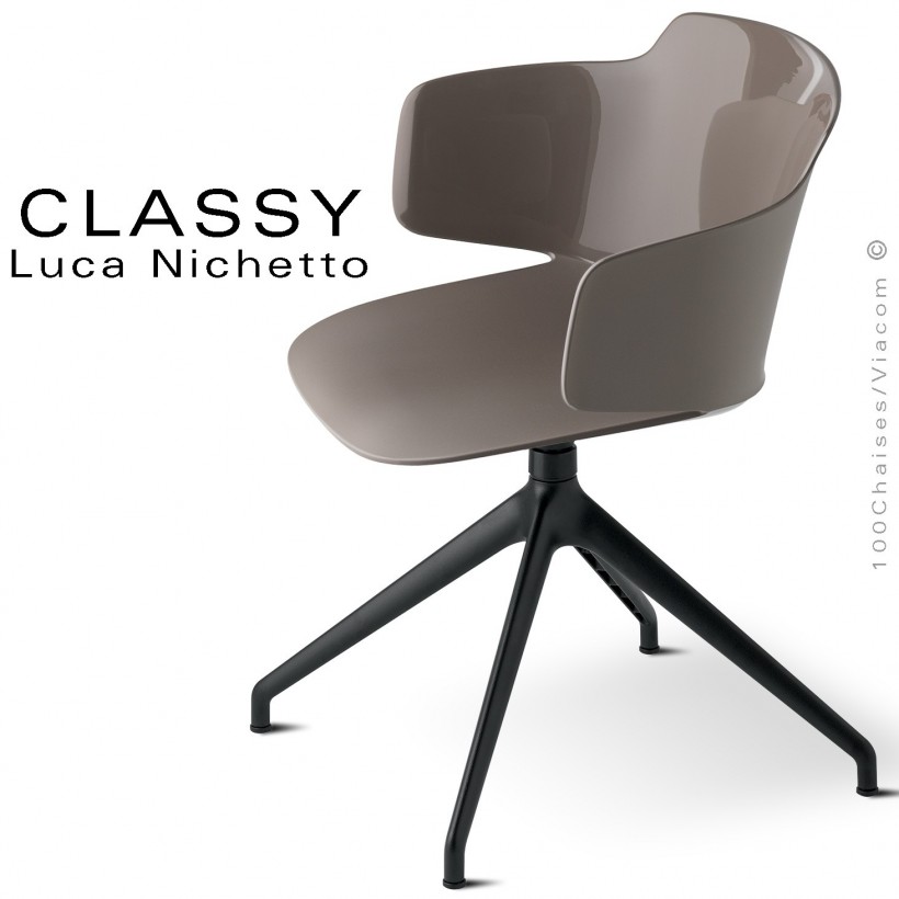 Chaise de bureau design CLASSY, piétement aluminium noir, assise coque plastique couleur argile, pivotante avec accoudoirs