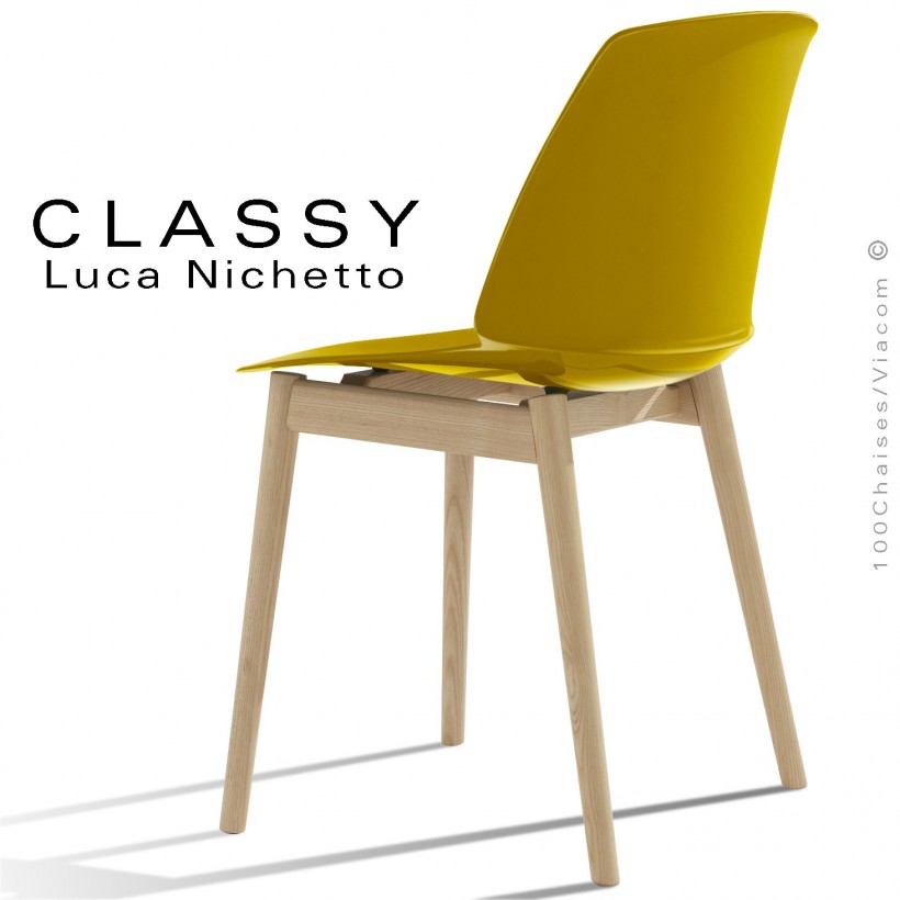 Chaise design CLASSY, piétement bois de Frêne vernis naturel, assise coque plastique couleur jaune curry.