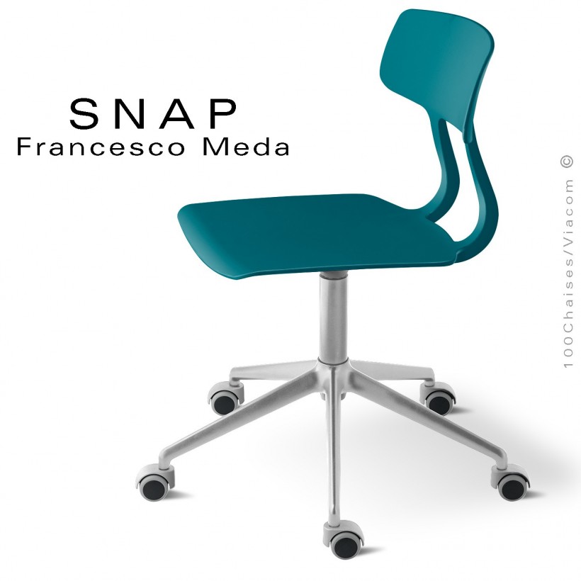 Chaise de bureau SNAP, piétement aluminium brillant avec roulettes, assise hauteur réglable, pivotante coque couleur bleu d'eau.